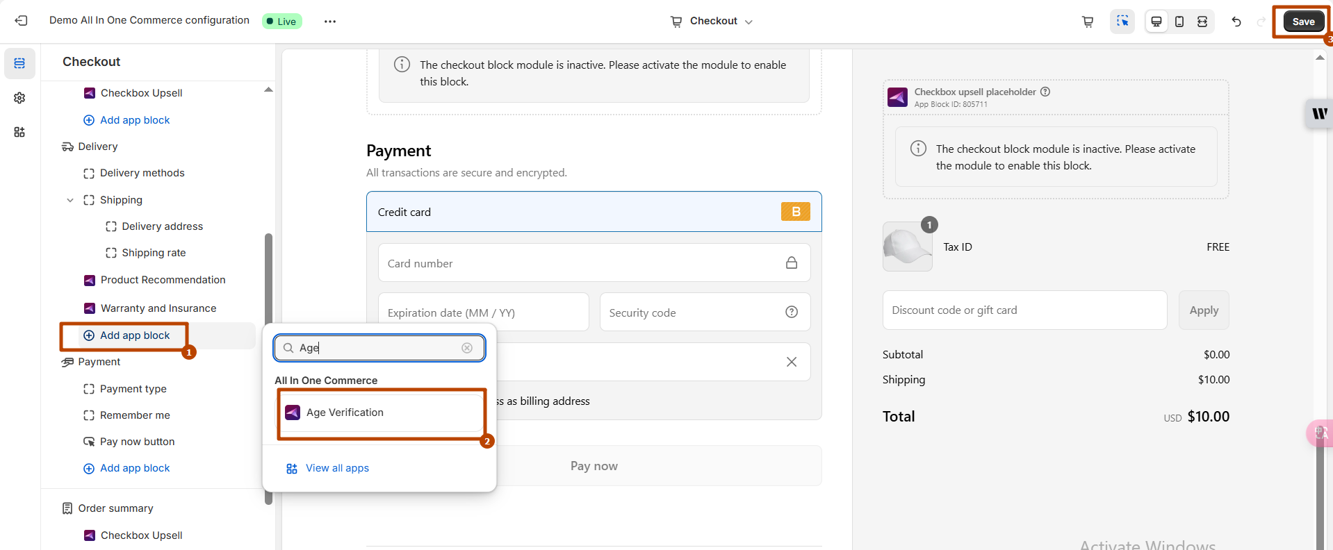 * Then you need to "add app block" and search extension "Age Verification" and add it, also set the settings for this extension block and save button. **Check Screenshots**<br>