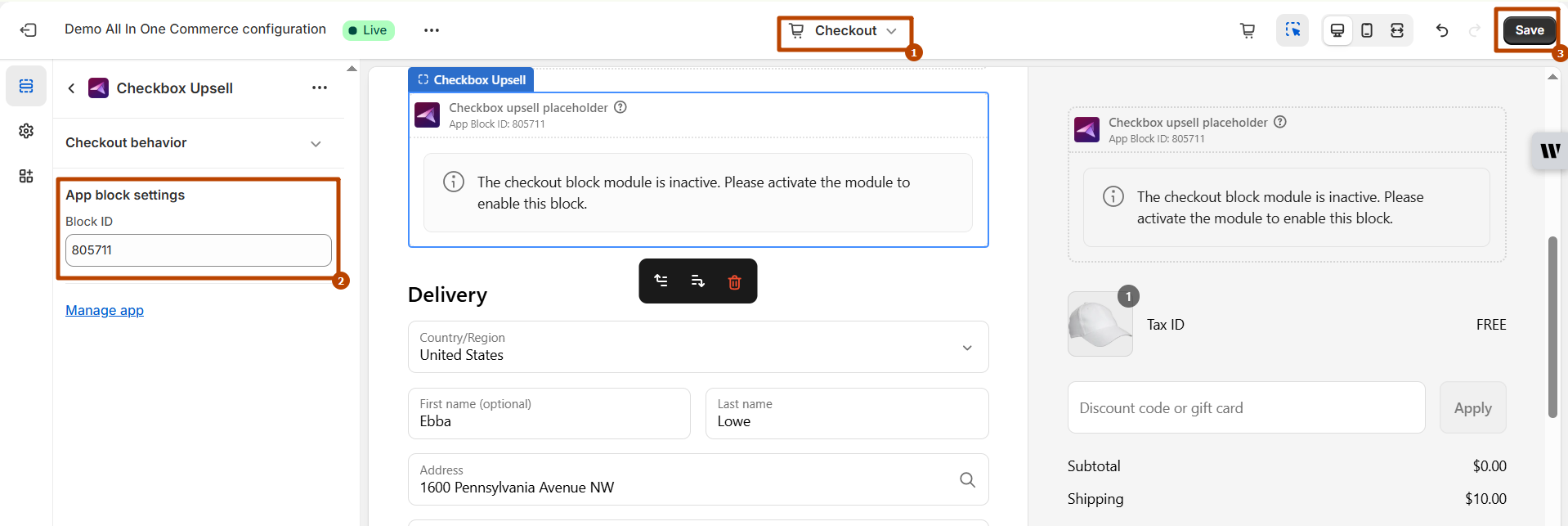 * Add the ‘Checkbox Upsell’ block to the checkout page.