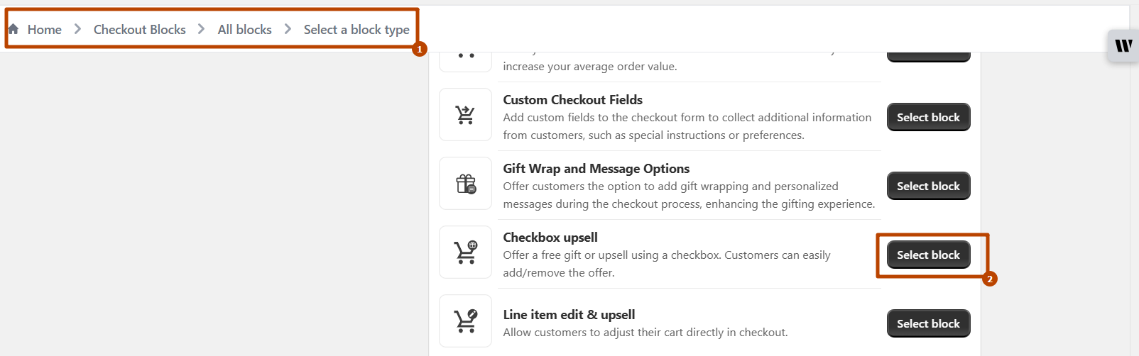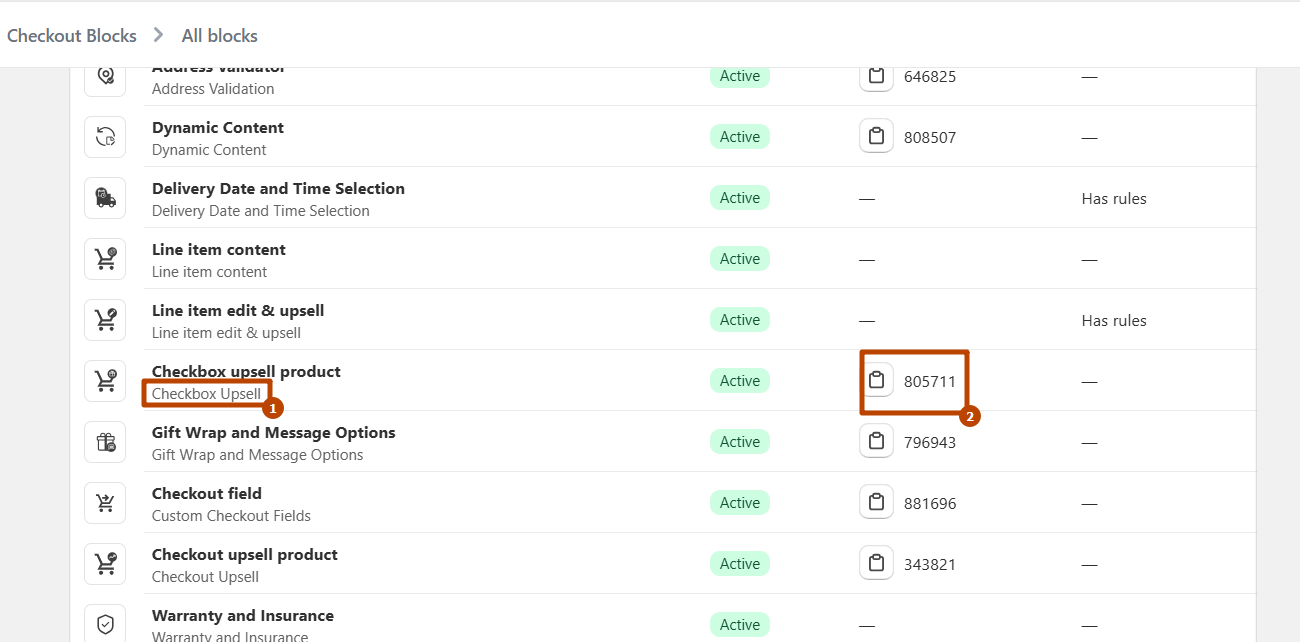 * Go to the Blocks section in the app settings. Copy the created checkout Upsell block to generated Block ID.<br>