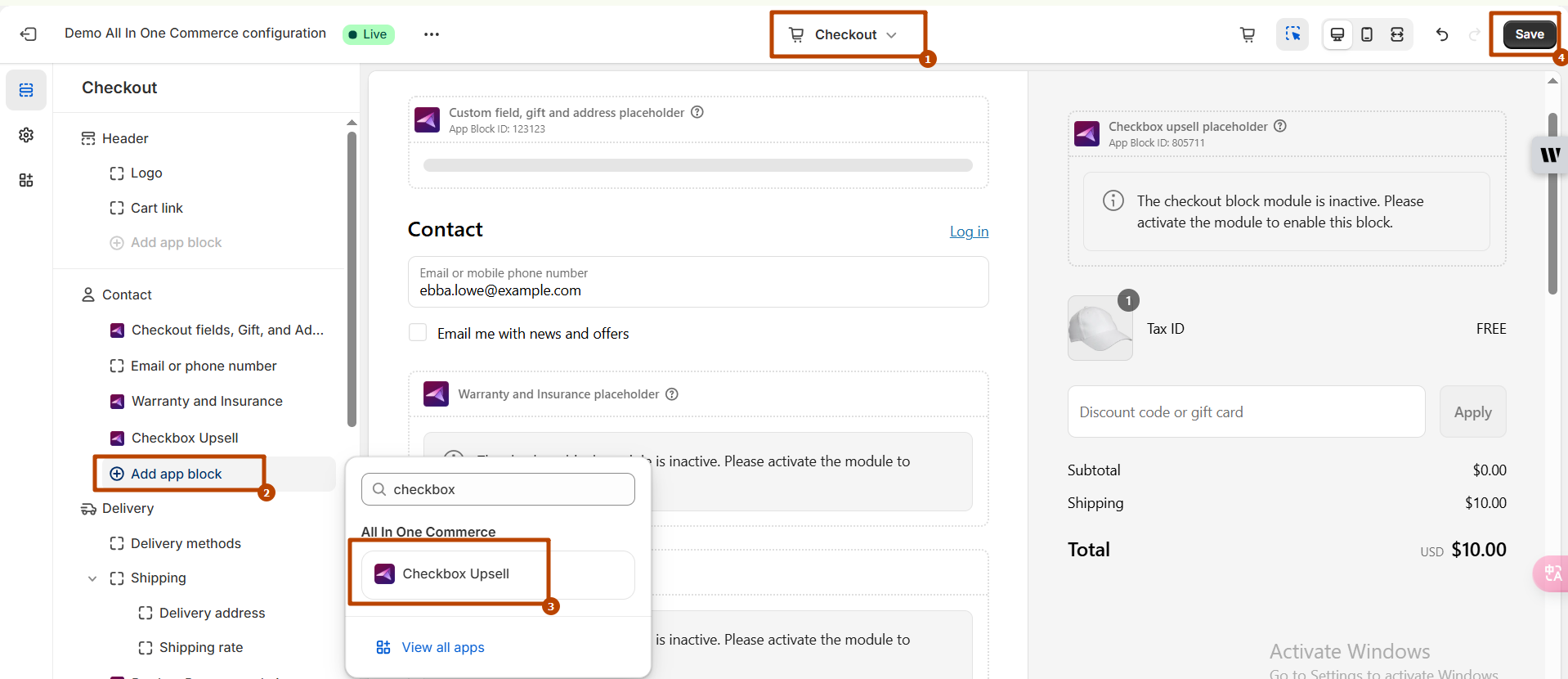 * Then you need to "add app block" and search extension "Checkbox Upsell" and add it. Click to added extension block and enter the Block ID in the block settings and save the configuration.. **Check Screenshot**\ <br>