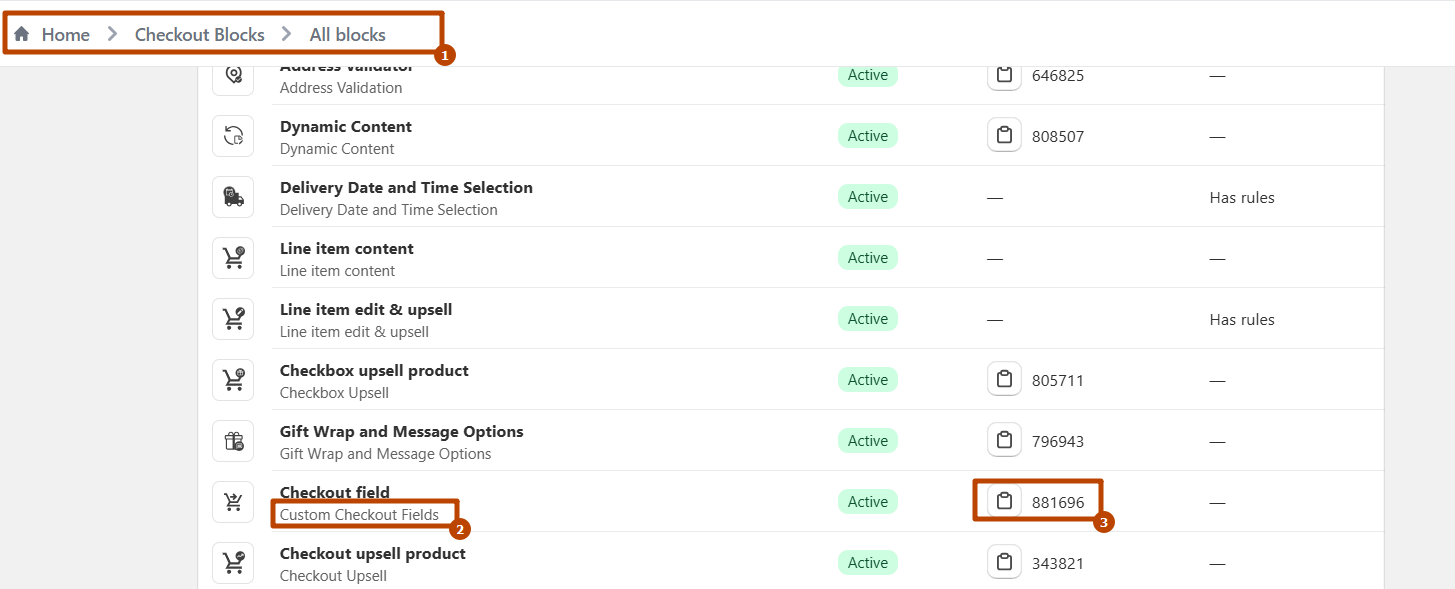 * Go to the Blocks section in the app settings. Copy the created checkout Upsell block to generated Block ID.<br>