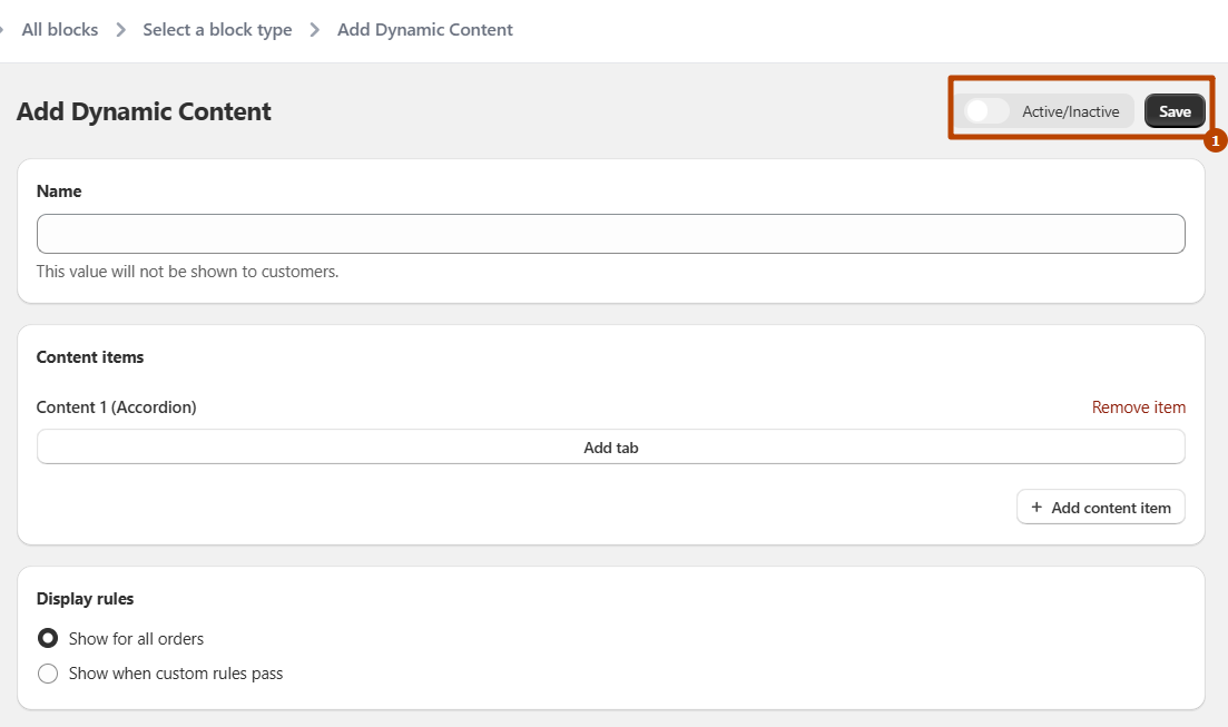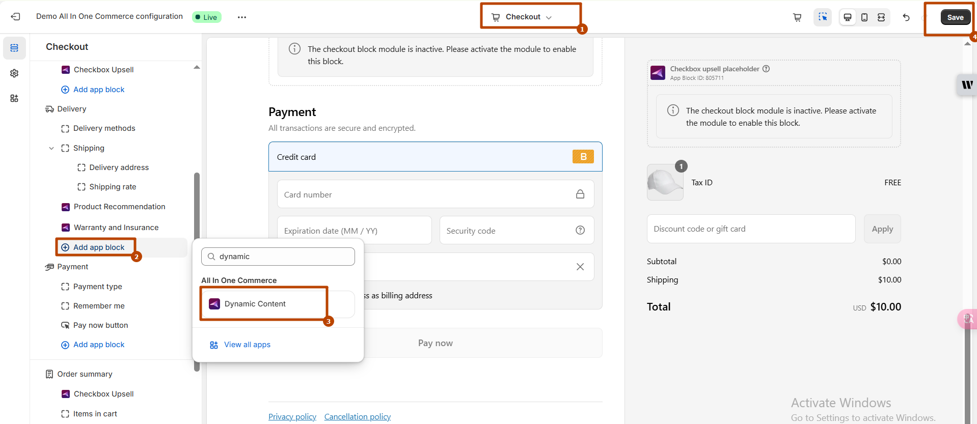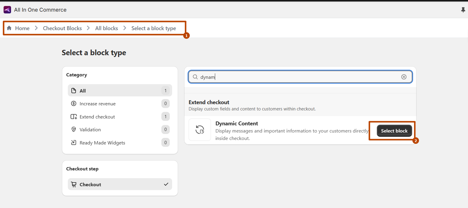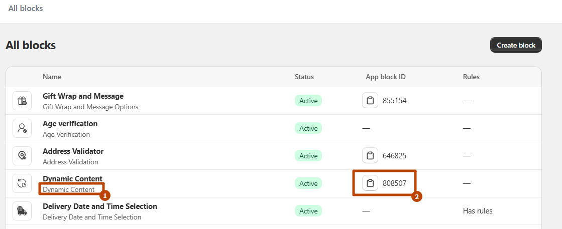 Then you need to "add app block" and search extension "Dynamic Content" and add it. Click to added extension block and enter the Block ID in the block settings and save the configuration.. Check Screenshot