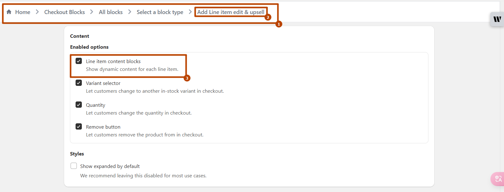 * Enable the "Line item content blocks" option with in the "Line Item Edit & Upsell" block in the Blocks section.<br>