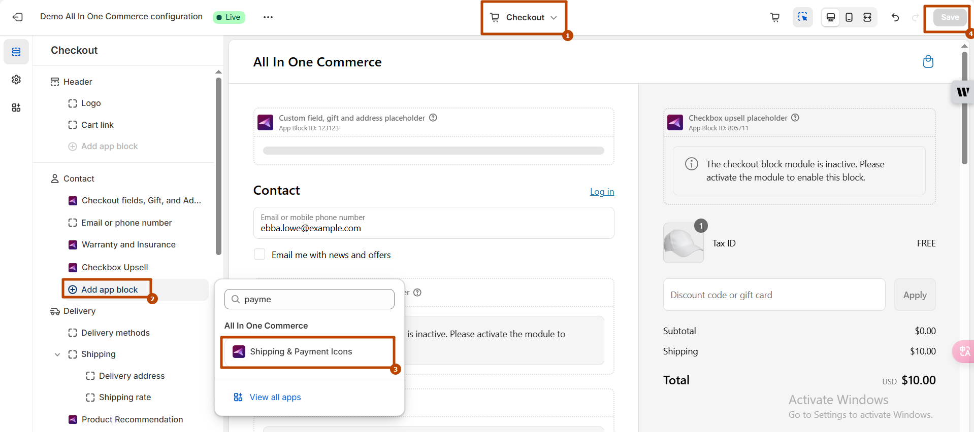 * Then you need to "add app block" and search extension "Line Item Edit & Upsell" and add it, also set the settings for this extension block and save button. **Check Screenshots**<br>