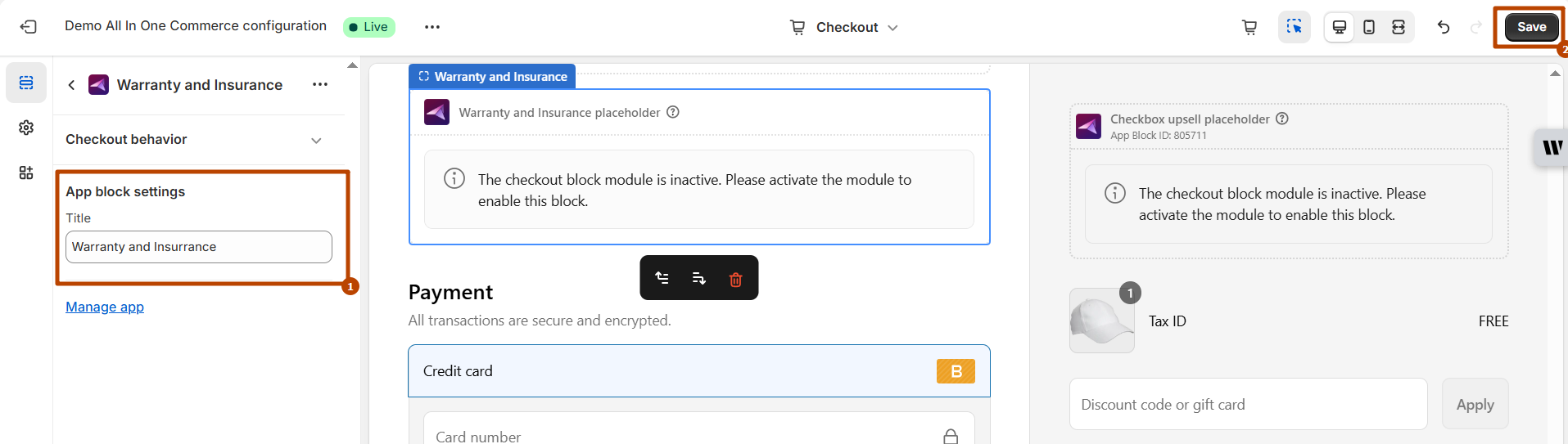 * Then you need to "add app block" and search extension "Warranty and Insurance" and add it, also set the settings for this extension block and save button. **Check Screenshots**<br>