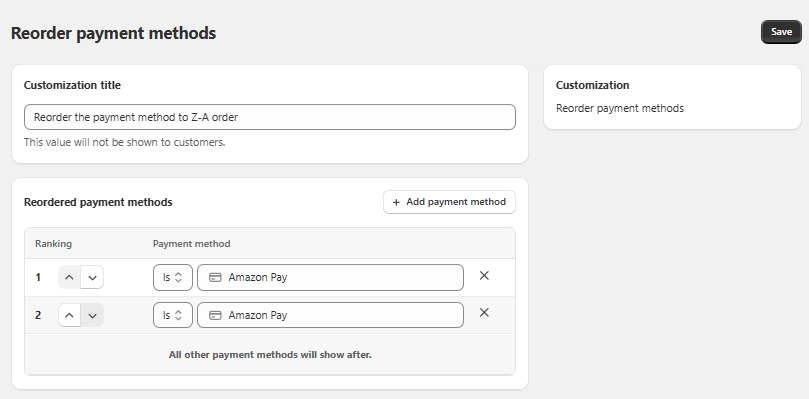 In payment method we have option to reorder the specific payment method on the checkout page according to the set rule with in the hide option under the payment method.