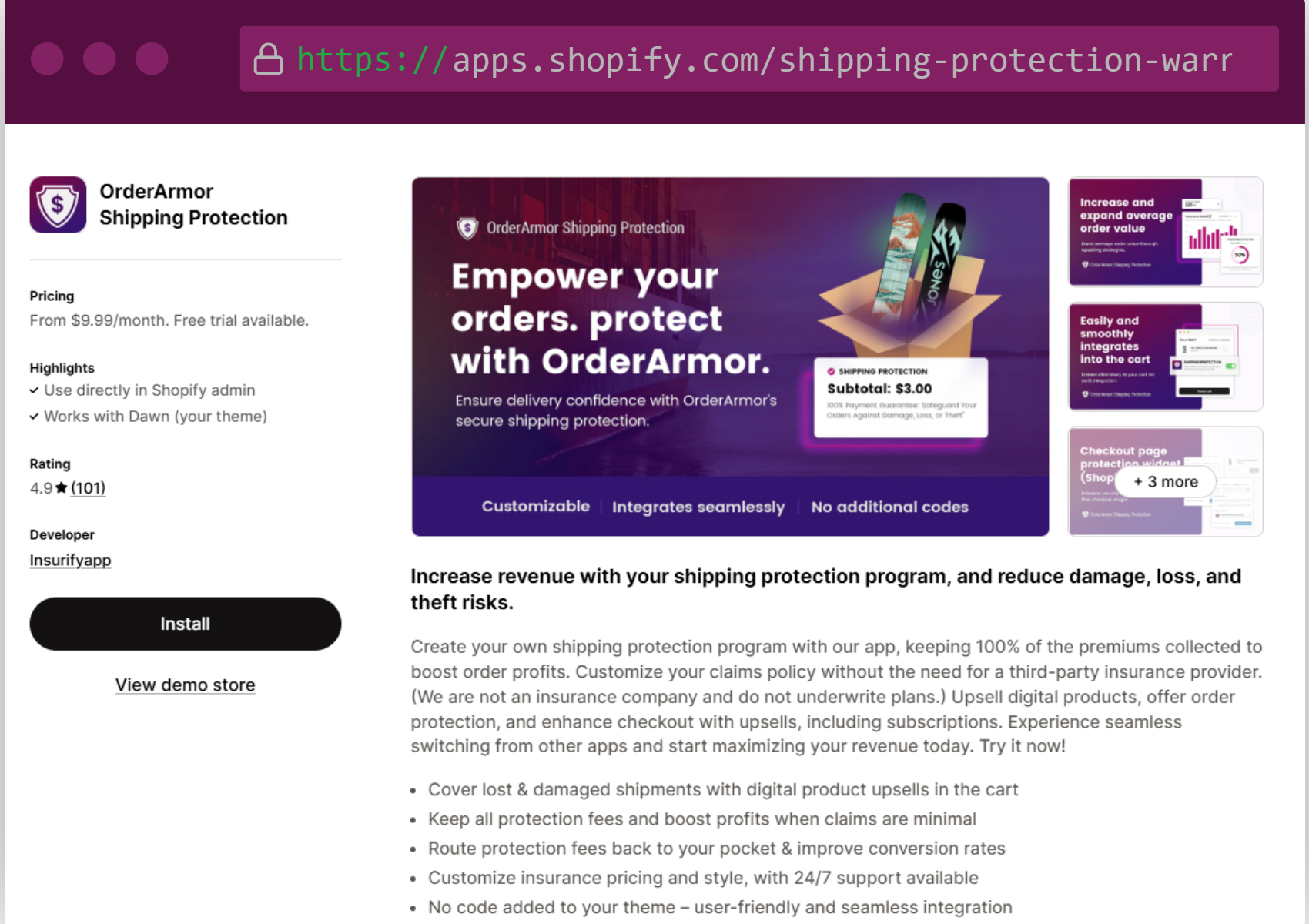 **OrderArmor Shipping Protection** is a robust platform designed to empower merchants with the ability to offer self-funded shipping protection plans directly to their customers. This tool facilitates merchants in managing their own shipping protection services, which cover claims for packages that are damaged, lost, or stolen. Unlike traditional insurance services, OrderArmor does not act as an underwriter. Instead, all premiums collected by the merchant are retained entirely in the merchant's account, providing a direct financial buffer to handle claims, thereby enhancing customer trust and satisfaction.